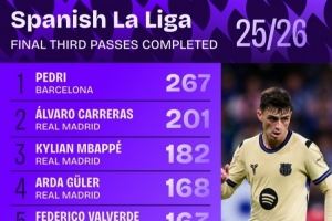 西甲进攻三区传球数排行:佩德里267次居首 5名皇马球员进前十